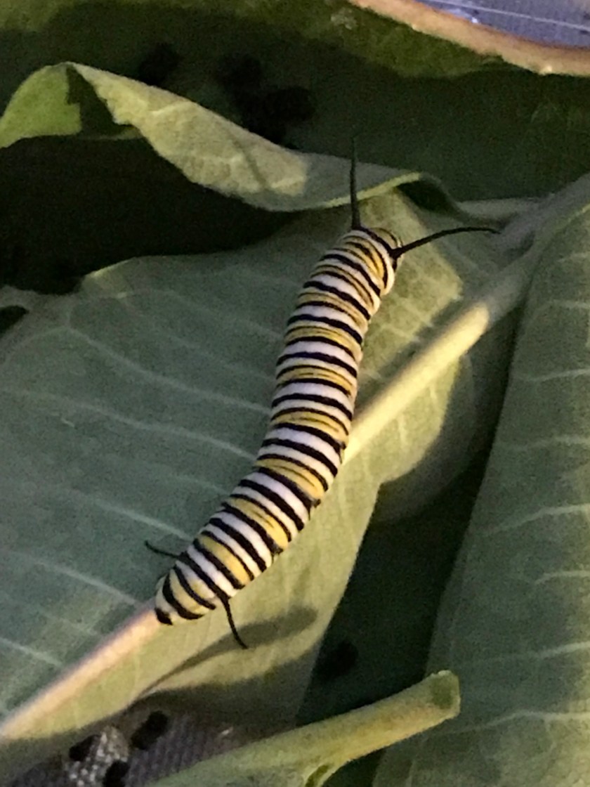 Monarchs only lay their eggs on Milkweed. That’s where you will find Caterpillars like this one. When they hatch, they are very small.